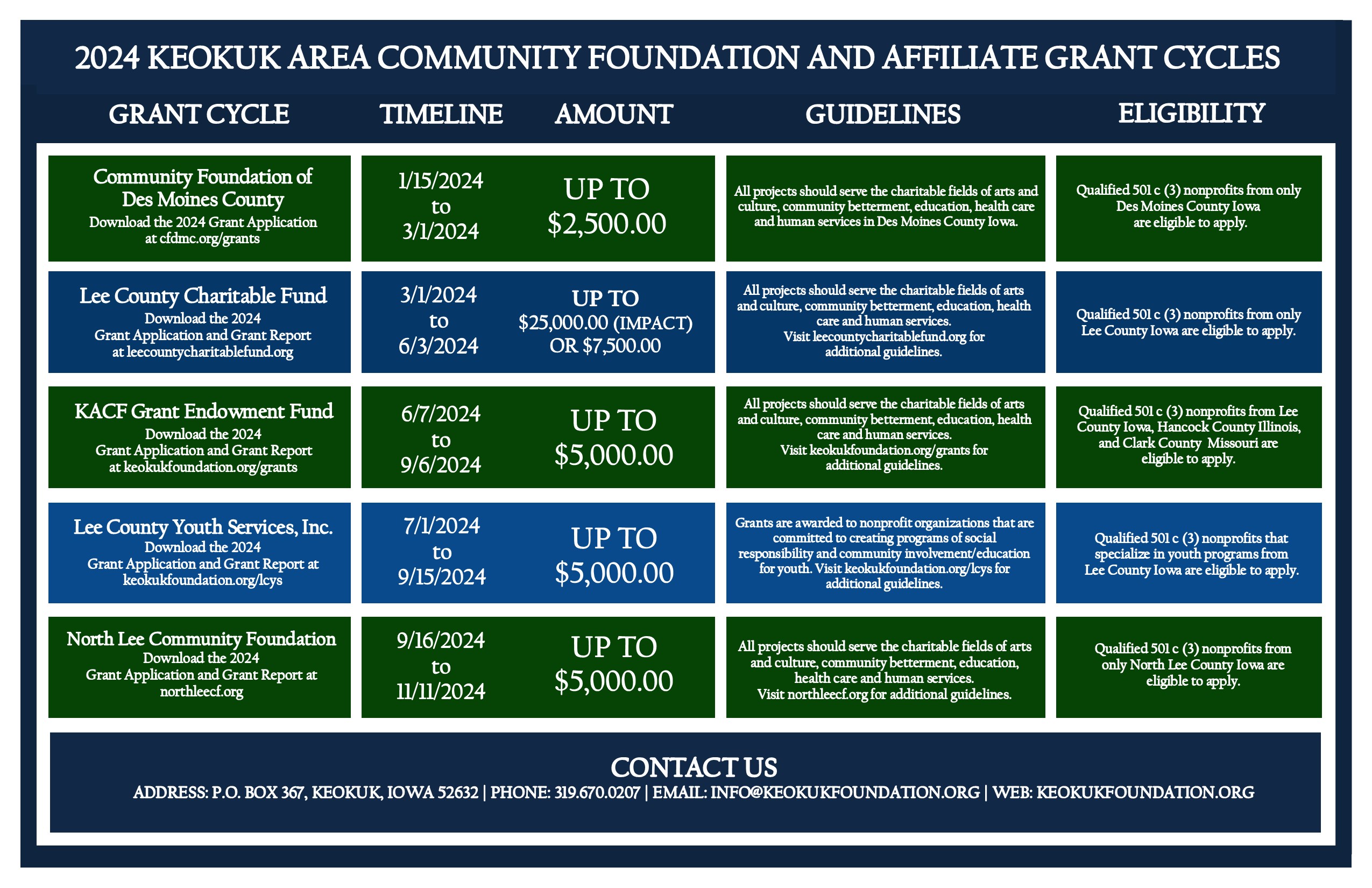 All Keokuk Area Community Foundation Grant Applications and accompanying materials are due on or before September 9, 2024. All Keokuk Area Community Foundation Grant Recipients will initially be notified by October 2024.